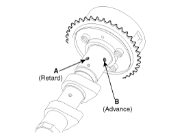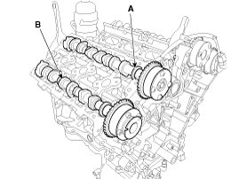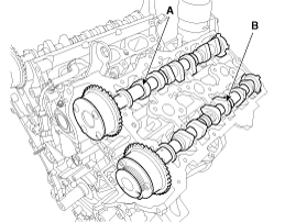 Установите левый впускной распредвал (А) и выпускной распредвал (В).