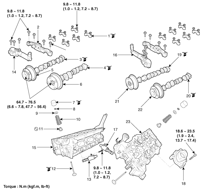 18. Кронштейн топливного насоса 19. Левый впускной распределительный вал 20. Левый распределительный вал выпускных клапанов 21. Левый впускной CVVT в сборе 22. Левый впускной CVVT в сборе 23. Левая головка блока цилиндров |