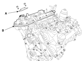 Снимите крышку левой головки блока цилиндров (В) и прокладку.