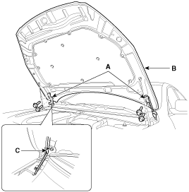 Отрегулируйте высоту капота, повернув амортизаторы капота (C).