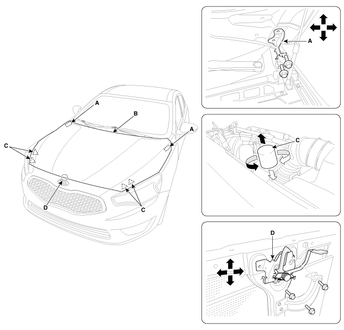 Ослабив болты крепления замка капота (D), отрегулируйте положение замка, перемещая его вверх или вниз, вправо или влево.