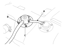 Снимите установочные болты (B), затем снимите клапан ORVR (C) с топливного бака,