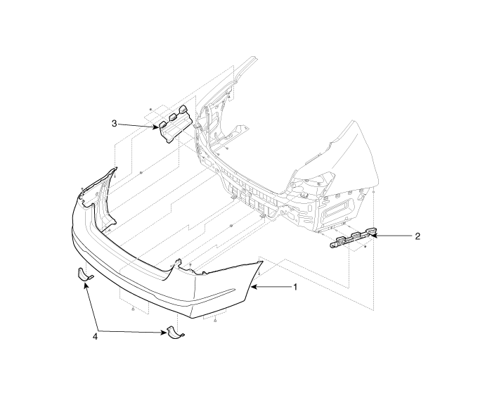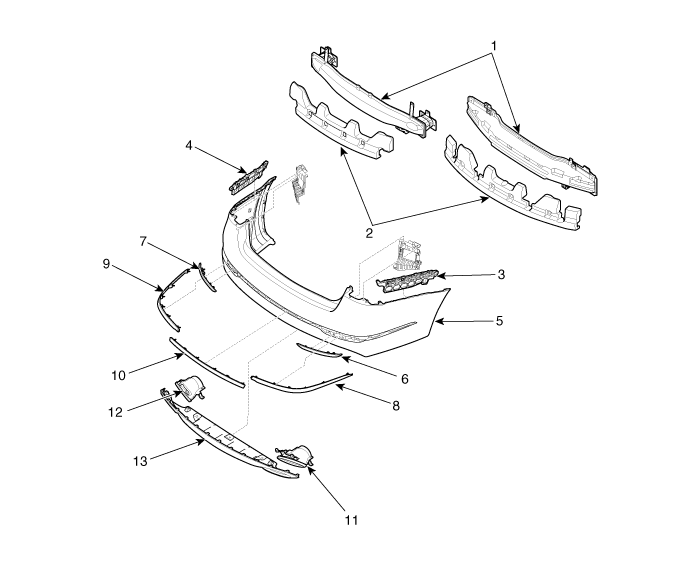 9. Боковой молдинг заднего бампера [LH] 10. Центральный молдинг заднего бампера 11. Хвостовая отделка в сборе [правая] 12. Хвостовая отделка в сборе [LH] 13. Нижняя крышка заднего бампера |