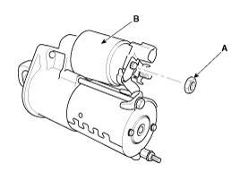 Отсоедините М-клемму (А) на блоке соленоида стартера (В).