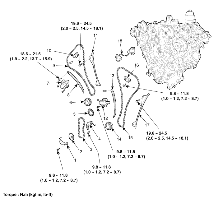 14. Звездочка левой цепи коленчатого вала 15. Левая цепь ГРМ 16. Левый кулачок цепи ГРМ к направляющей кулачка 17. Левая направляющая цепи ГРМ 18. Адаптер натяжителя |