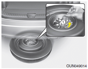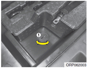 6. Снимите фиксатор (1) с центра запасного колеса.