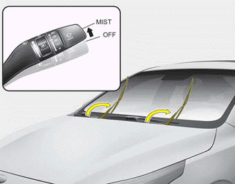 После выключения двигателя переместите стеклоочиститель переключается на одиночный режим (MIST) положение в течение 20 секунд и удерживайте переключатель более 2 секунд пока щетка стеклоочистителя не окажется в полностью поднятое положение.