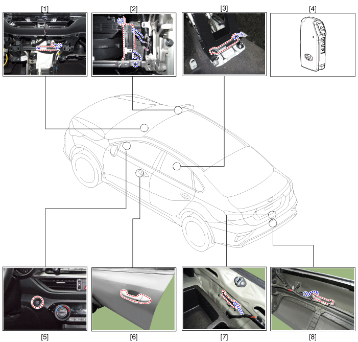 2. Встроенный блок управления кузовом (IBU) 3. Внутренняя антенна 2 4. Брелок-ключ |