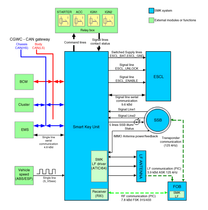 Он собирает информацию о состоянии автомобиля из других модулей (скорость автомобиля, состояние тревоги, дверь водителя открыта...), считывает входы (например, SSB, емкостной датчик / Кнопка блокировки, переключатель положения PARK), управляет выходами (например, внешним и внутренним антенны) и связывается с другими устройствами через сеть CAN, а также однолинейные интерфейсы.