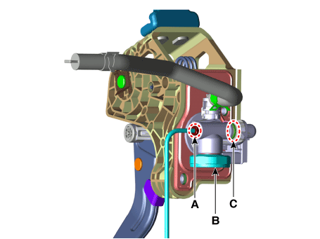 Снимите регулятор (В) с главного цилиндра после снятия стопорный штифт (С).