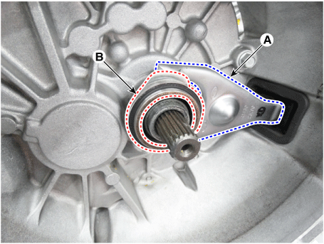 Установите подшипник выключения сцепления (В) и вилку выключения сцепления (А). в то же время.