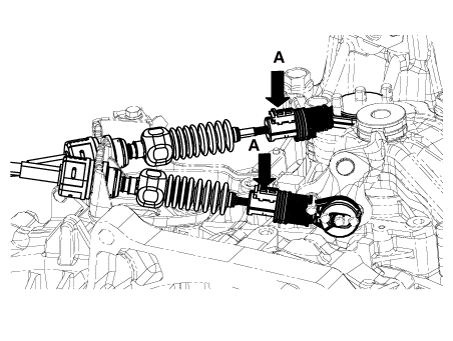 Снимите фиксатор троса переключения передач (А) после ослабления гаек (В). Затем, снимите трос переключения передач, потянув его в сторону салона автомобиля.