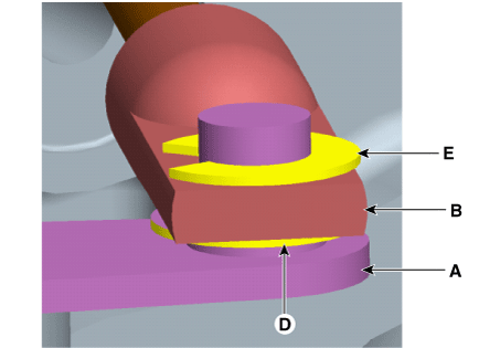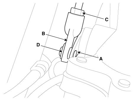Временно установите конец штока (В) на рычаг турбонагнетателя (А). Не затяните стопорную гайку конца штока (C) и С-образное кольцо (D).
