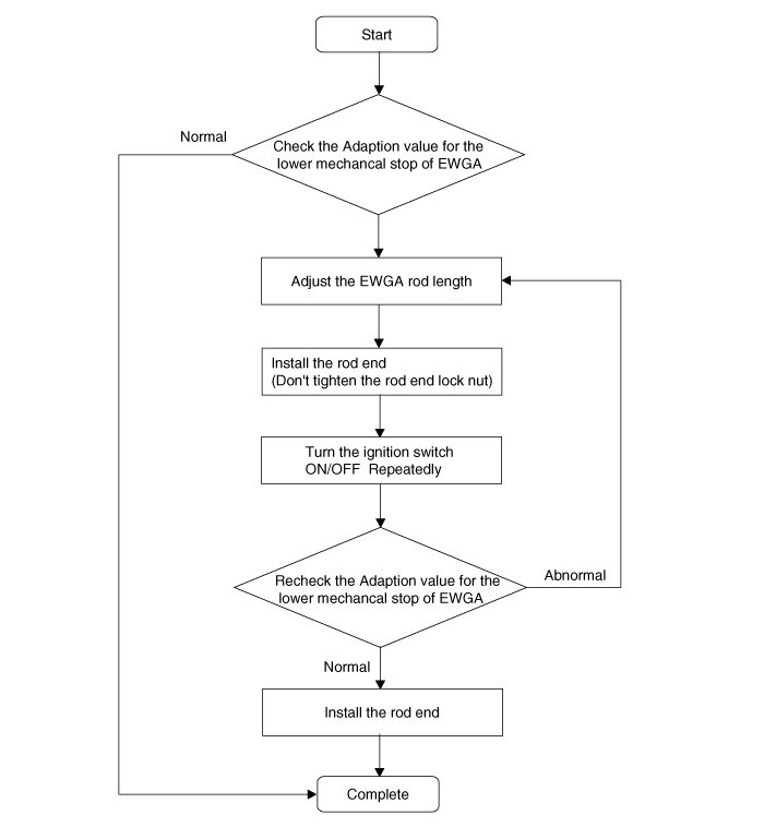 Не запуская двигатель, включите зажигание на 5 секунд, затем выключите зажигание на 5 секунд, затем проверьте «Значение адаптации для нижнего механического останова EWGA» на KDS. Повторяйте этот шаг до тех пор, пока величина изменения значения адаптации не сравняется с к предыдущему циклу ниже 0,05 В.
