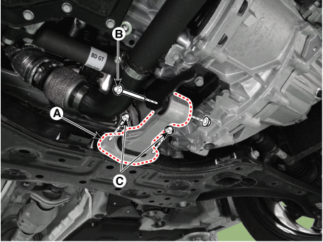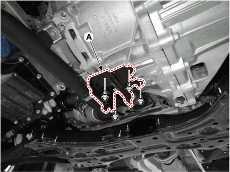 .Отверните болт (А) крепления опорного кронштейна коробки передач.