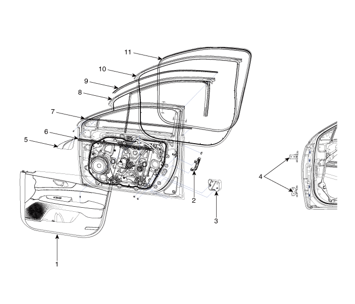 8. Накладка лобового стекла передней двери 9. Молдинг коробки передней двери 10. Боковой уплотнитель передней двери 11. Боковой уплотнитель кузова передней двери |