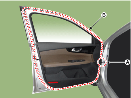 Отсоедините зажимы, затем снимите боковой уплотнитель передней двери (B).