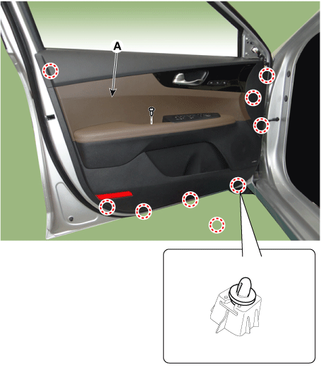 Используя отвертку или съемник, снимите внутренний квадрант передней двери. крышка (А).