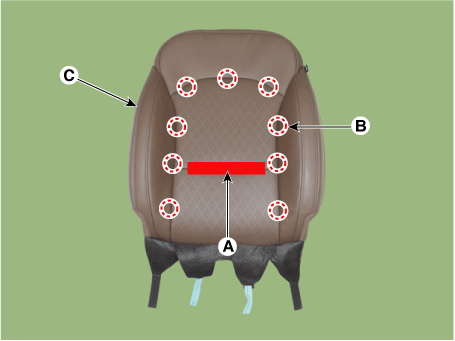 После удаления ленты-липучки (A) и кольцевых зажимов (B) внутри обивку спинки переднего сиденья, снимите обивку спинки сиденья (С).