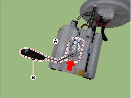 Нажмите на фиксирующий крючок (А) отверткой и снимите датчик уровня топлива (В). в направлении стрелки.