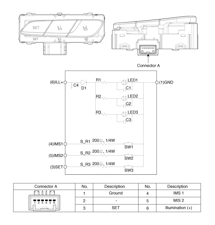 При нажатии каждого переключателя проверьте поток электроэнергии между встроенными разъем переключателя сиденья с памятью и заземление, и если электричество не соответствует спецификации, замените переключатель.