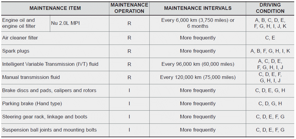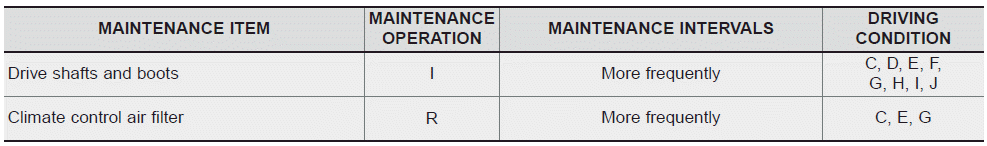 Следующие элементы должны обслуживаться чаще на обычно используемых автомобилях. в тяжелых условиях вождения. Ссылаться в приведенной ниже таблице указаны соответствующие интервалы технического обслуживания.