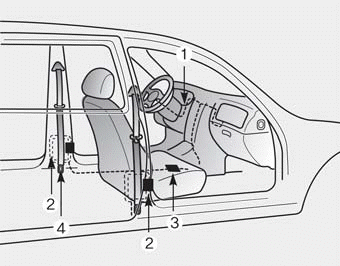 Система преднатяжения ремней безопасности состоит в основном из следующих компонентов. Их расположение показано на иллюстрация: