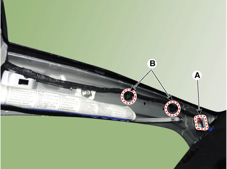 Отсоедините главный разъем обивки крыши (А) и монтажные зажимы (В). в передней стойке.