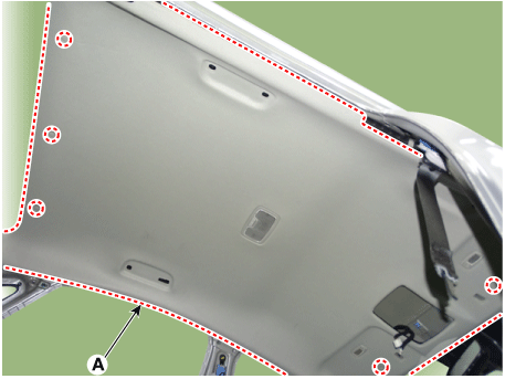 Снимите обивку крыши в сборе (А) с панели кузова и перенесите из автомобиля через переднюю дверь.