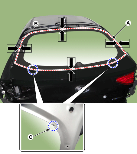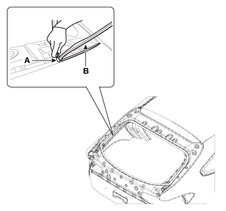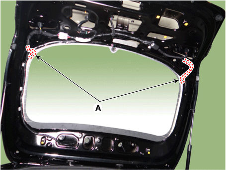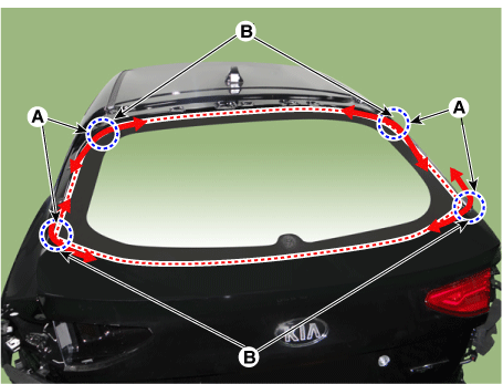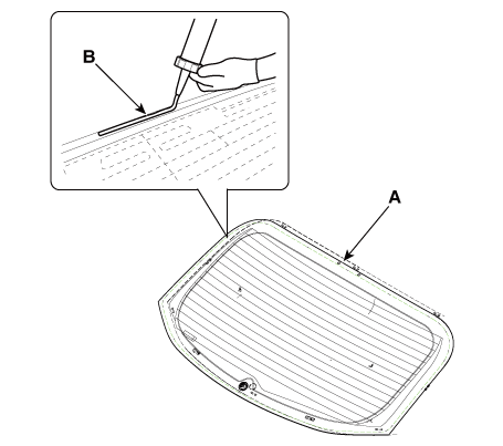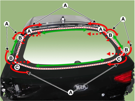 С помощью пистолета для герметика нанесите герметик (В) на край задней двери багажника. оконное стекло (А).