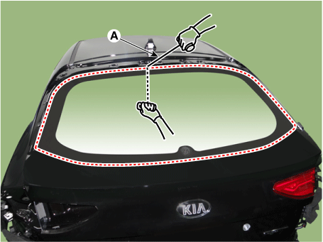 С помощью держателя стекла отрегулируйте оконное стекло задней двери (А) по размеру. установочные метки на кузове и слегка нажмите на стекло задней двери, чтобы сделайте края полностью сидящими на склеиваемой поверхности тела.