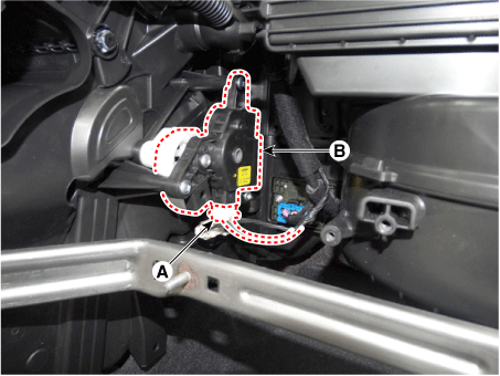 Отсоедините разъем (B) и снимите датчик температуры со стороны пассажира. привод управления (A) после ослабления крепежных винтов.