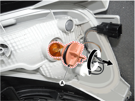 Снимите патрон лампы переднего указателя поворота (А), повернув его против часовой стрелки.