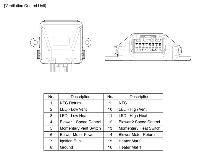 Проверка первого обогревателя сиденья 1. Проверьте непрерывность цепи и измерьте сопротивление между клеммами № 4 и № 6. [Подушка] №Описание№Описание1Нагреватель (-)3NTC (+)2NTC (-)4Нагреватель (+) [Сзади] 2. Измерьте ...