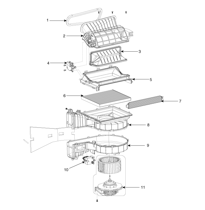 6. Воздушный фильтр климат-контроля 7. Крышка воздушного фильтра климат-контроля 8. Верхний корпус вентилятора |