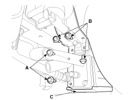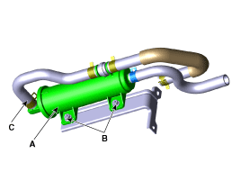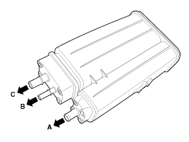 Снимите дополнительный адсорбер (А), отвернув гайки (В) и отсоединив вентиляционные шланги (С).