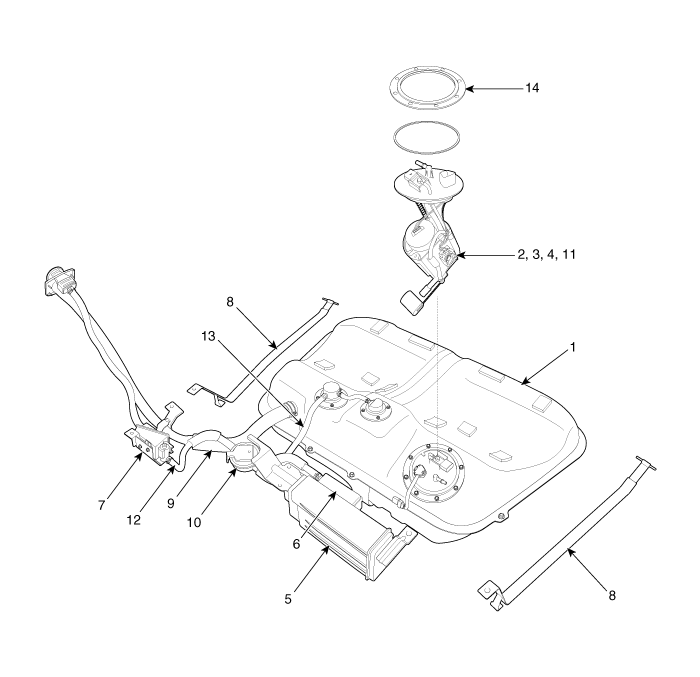 9. Топливный шланг 10. Обнаружение утечки естественного вакуума (NVLD) 11. Датчик уровня топлива (ДУТ) 12. Вентиляционный шланг 13. Паровая трубка 14. Крышка пластины топливного насоса |