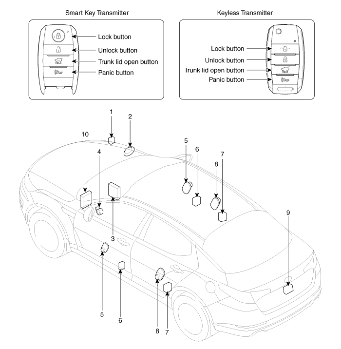 2. Грабительский рог 3. BCM и радиочастотная антенна 4. Ключевой выключатель предупреждения 5. Переключатель передней двери |