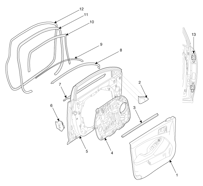 9. Молдинг коробки передней двери 10. Стеклоподъемник передней двери в сборе 11. Боковой уплотнитель кузова передней двери 12. Боковой уплотнитель передней двери 13. Петля передней двери |