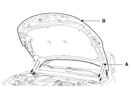 Ослабив болты крепления петли капота (А), снимите панель капота (В).