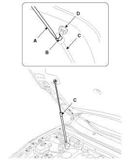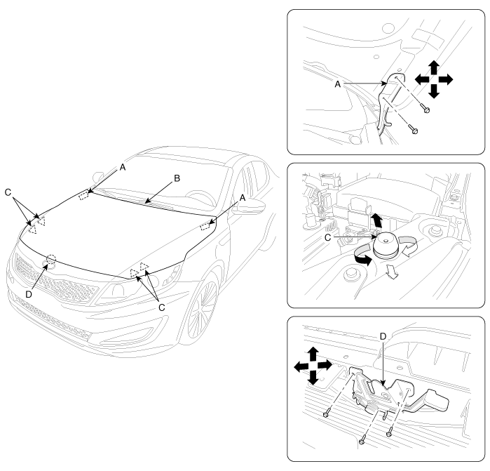 Ослабив болты крепления замка капота (D), отрегулируйте положение замка, перемещая его вверх или вниз, вправо или влево.