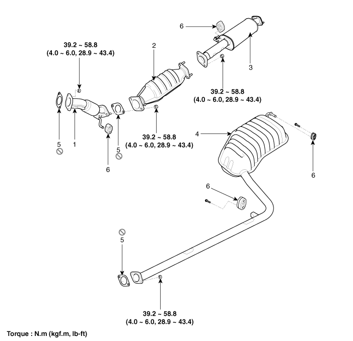 Снятие и установка 1. Снимите передний глушитель (А). Момент затяжки: 39,2 ~ 58,8 Н·м (4,0 ~ 6,0 кгс·м, 28,9 ~ 43,4 фунт-фут) 2. Снимите каталитический нейтрализатор (A). Момент затяжки: 39,2 ~ 58,8 Нм...