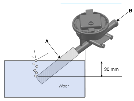 После погружения шланга (A) в воду подайте давление более 6 мбар (положительное) на порт атмосферного давления (B).