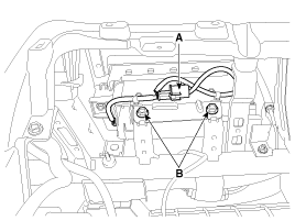 Отсоедините разъем подушки безопасности пассажира (А) и снимите болты крепления РАБ (В).