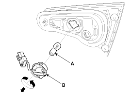 Замените лампы фонарей заднего хода (А), повернув патроны (В) против часовой стрелки.