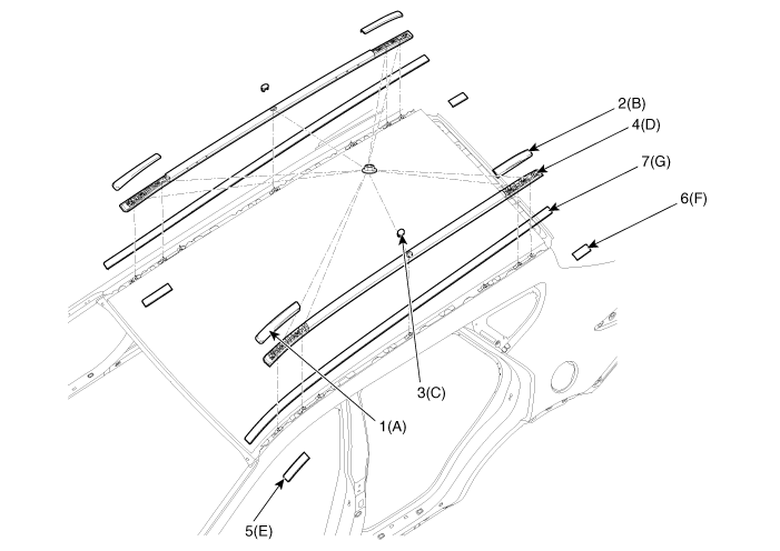 Снимите передний молдинг крыши (Е) и задний молдинг крыши (F).