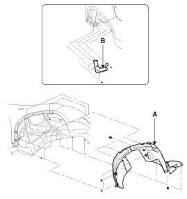Ослабив крепежные зажимы и винты, снимите защита переднего колеса (A), брызговик (B).