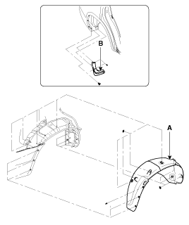Ослабив крепежные зажимы и винты, снимите защита заднего колеса (A) и брызговик (B)