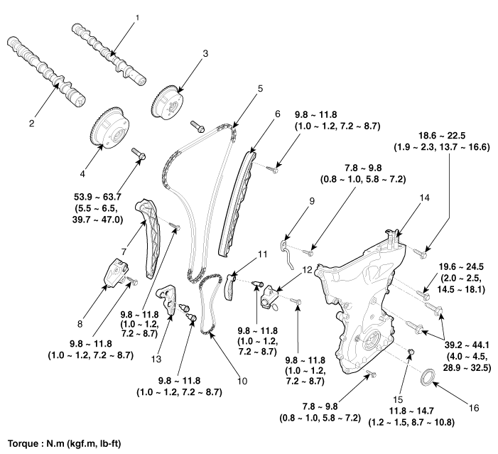 2. Распредвал выпускных клапанов 3. Впускной CVVT в сборе 4. Выхлоп CVVT в сборе 5. Цепь ГРМ 6. Направляющая цепи ГРМ |