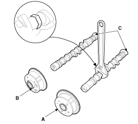 Отсоедините впускной CVVT в сборе (A) и выпускной CVVT в сборе (B).